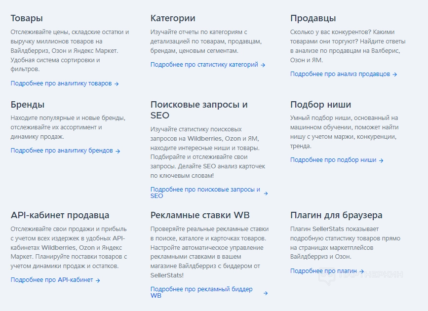 Специалисты площадки SellerStats подготовили множество удобных отчетов, позволяющих решить любые задачи по анализу продаж на маркетплейсах. Подробности — на скриншоте.