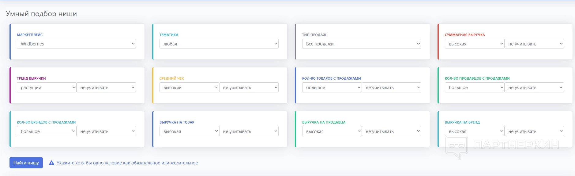 - Указывает важность (относительный вес) каждого условия для подбора ниши (хотя бы одно условие должно быть указано как «обязательно» или «желательно»).