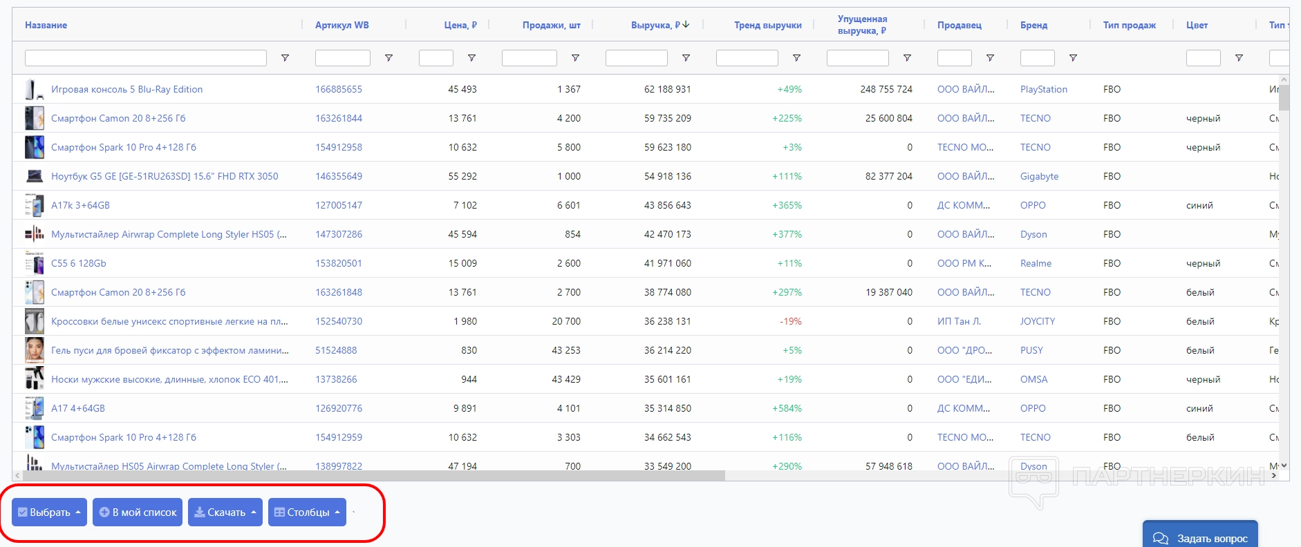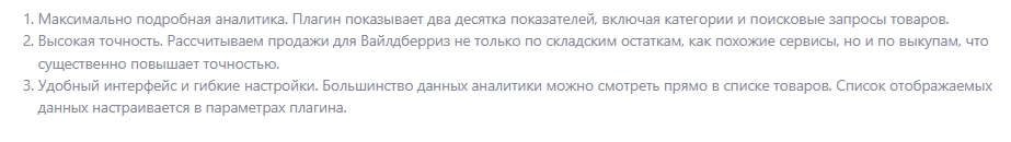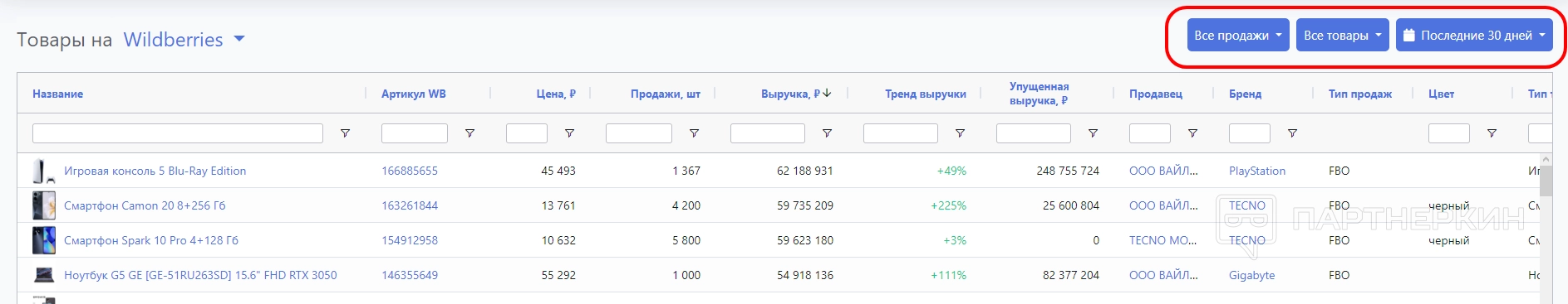 - Высокая точность данных . Алгоритмы рассчитывают продажи не только по складским остаткам, но и по выкупам.