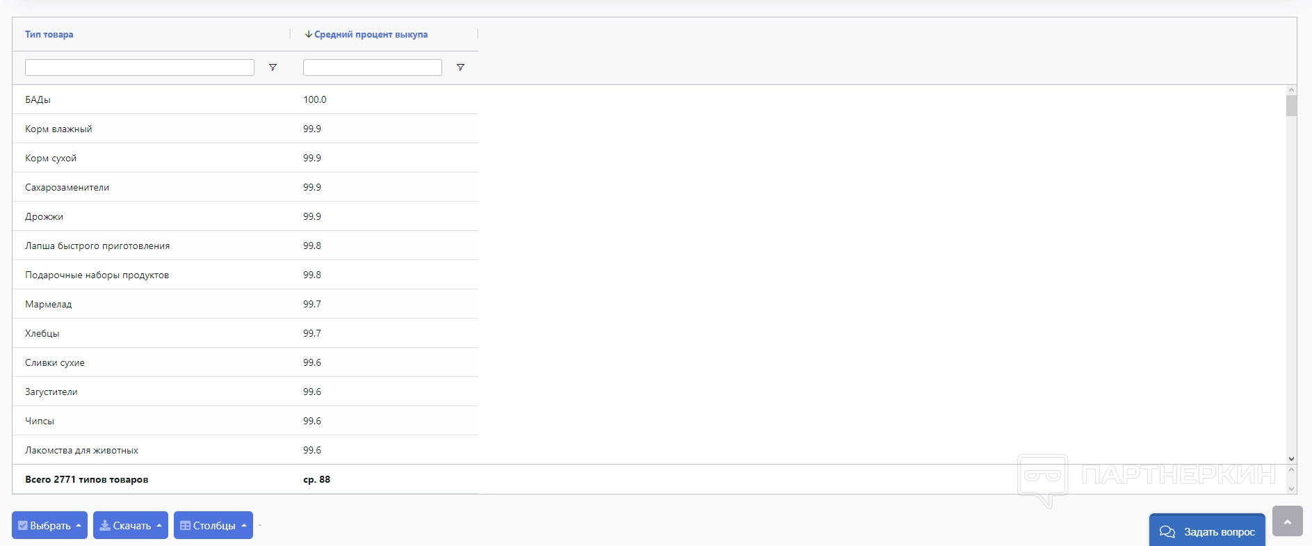 - В таблице показан средний процент выкупа различных товаров по обобщенной статистике выбранного маркетплейса за последние 90 дней.