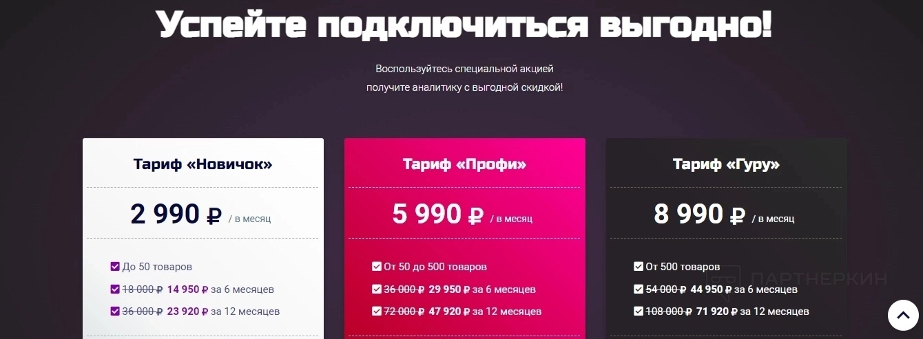 - тариф «Гуру» — самый обширный тарифный план, рассчитан на товарооборот более 500 единиц.