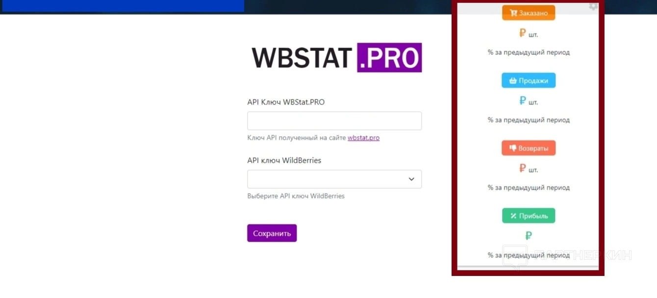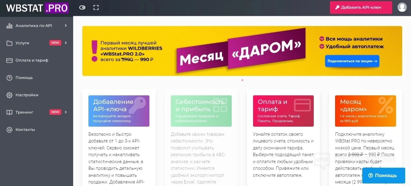 После авторизации пользователь попадает на главный экран кабинета, где в основном расположены вспомогательные материалы: инструкция по подключению кабинета к магазину на Wildberries через API, тарифы и так далее.