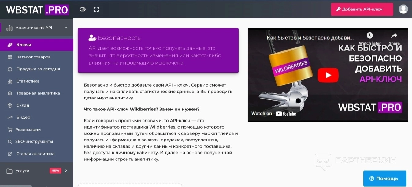 Чтобы работа с сервисом началась, нажимаем на раздел Добавление API-ключа.