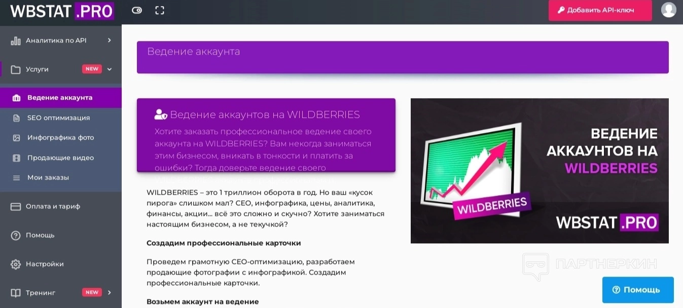 Следующий раздел — Услуги. Здесь пользователь может подать запрос на подключение дополнительных возможностей сервиса, о которых мы рассказывали выше (ведение аккаунта, инфографика и другие). Важно отметить, что данные услуги оплачиваются отдельно от тарифа, что может показаться некоторым недостатком платформы.