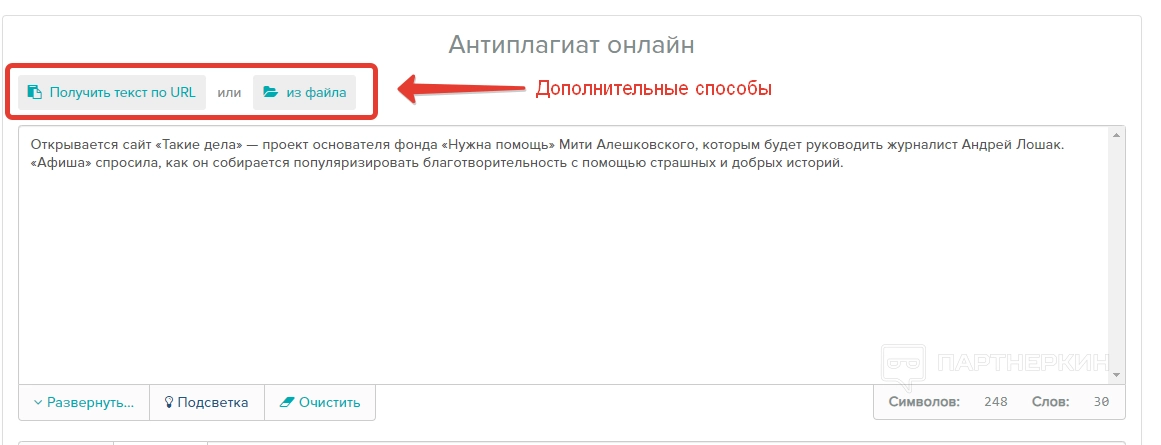 Проверка осуществляется довольно просто. Пользователю нужно всего лишь вставить текст в соответствующую форму и кликнуть на кнопку проверки. Текст можно указать и другими способами: