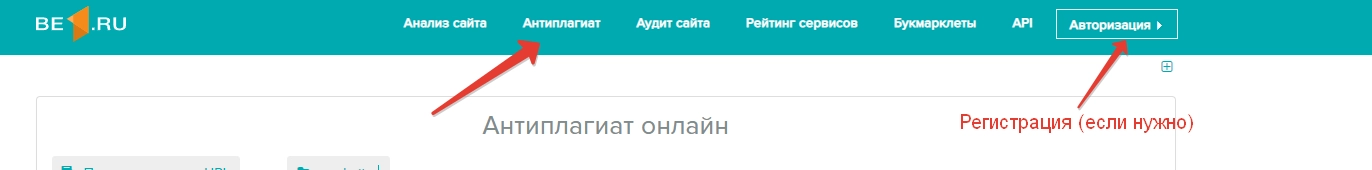 В сервисе предусмотрена возможность создавать учетные записи, получая после этого доступ к личному кабинету. Однако для работы с текстами делать это не придется. Достаточно просто открыть сервис и перейти в раздел «Антиплагиат».