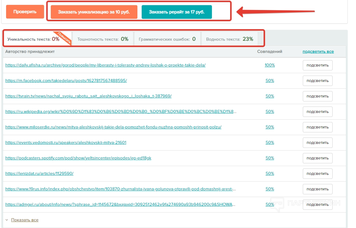 Если пользователь не может самостоятельно исправить текст и сделать его уникальным, можно воспользоваться услугами уникализации и рерайта. Для этого стоит всего лишь пополнить счет личного кабинета и кликнуть на соответствующие кнопки.