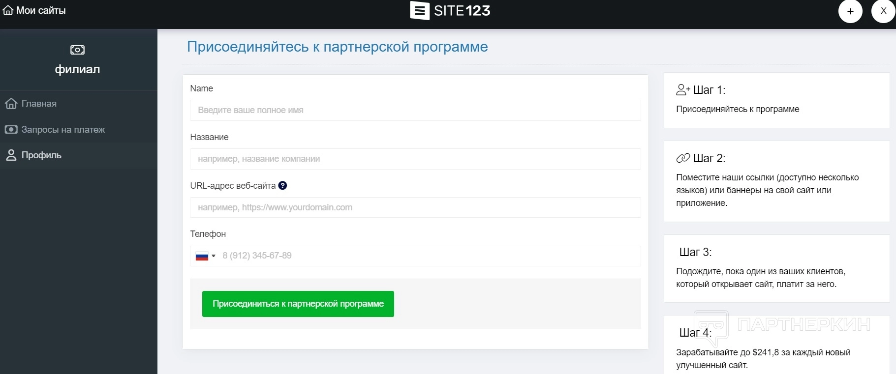 В личном кабинете партнер может просматривать статистику по своим рефералам, по доходу. Посреднические сборы отсутствуют, Site123 — это прямой рекламодатель.