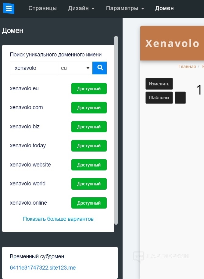 Также можно купить и подключить домен второго уровня. Чтобы приобрести домен, найти подходящий, можно воспользоваться разделом «Домены» на сайте конструктора, либо войти в Редактор и подобрать подходящий домен уже там, нажав на Панель управления.