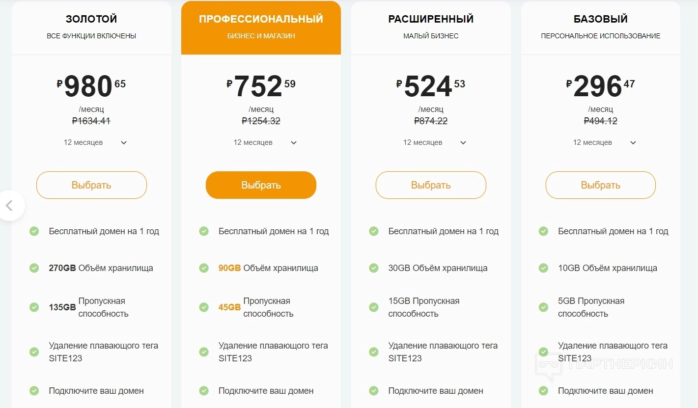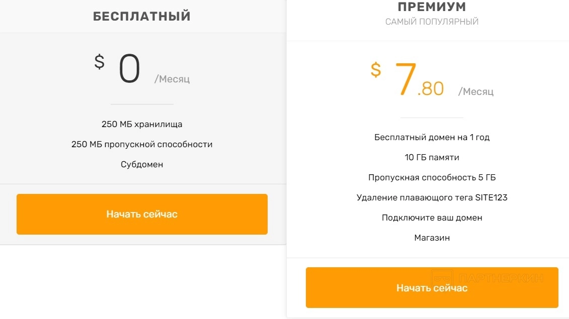 Стоимость премиум-пакетов начинается от $7,8 в месяц. На Базовом премиум-тарифе бесплатный домен предоставляется на 1 год. Место на диске составляет 10 Гб, пропускная способность 5 Гб. Есть возможность удалить логотип Site123.