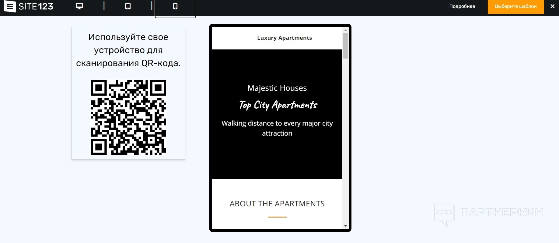 Если нажать на шаблон, он открывается в соседней вкладке. Можно посмотреть, как он выглядит на разных типах устройств: ПК, смартфоне, планшете.