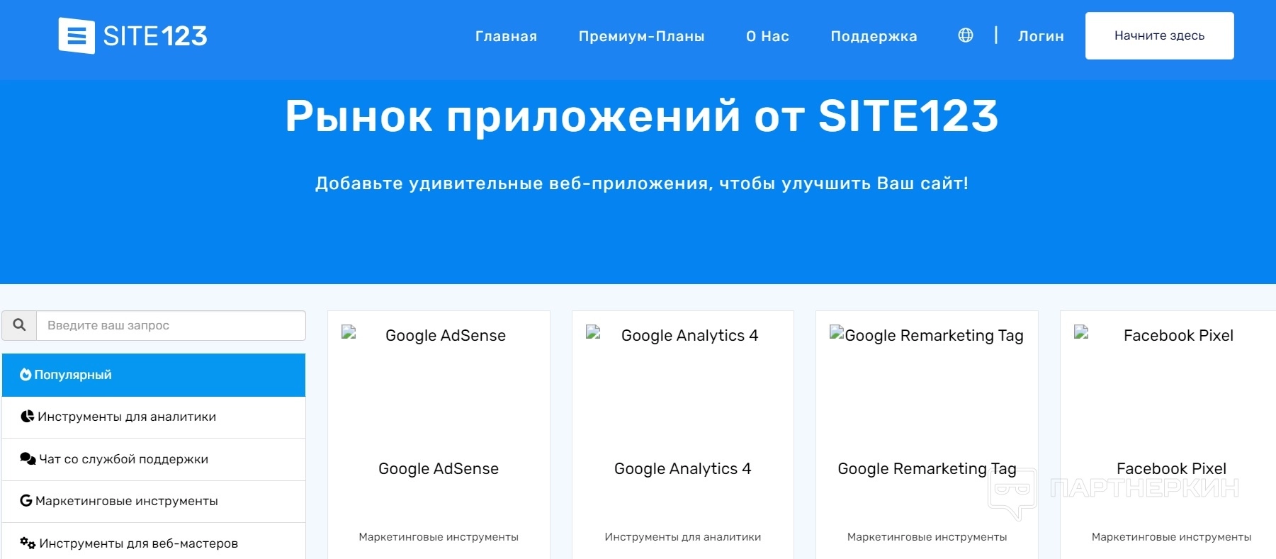 Site123 позволяет бесплатно создавать неограниченное количество целевых страниц. Платформа интегрирована с Google Analytics, что позволяет анализировать трафик за минуту. Есть интеграция с другими сервисами из списка Рынка приложений: пикселями Facebook*, Hotjar, Optimizely и другими.