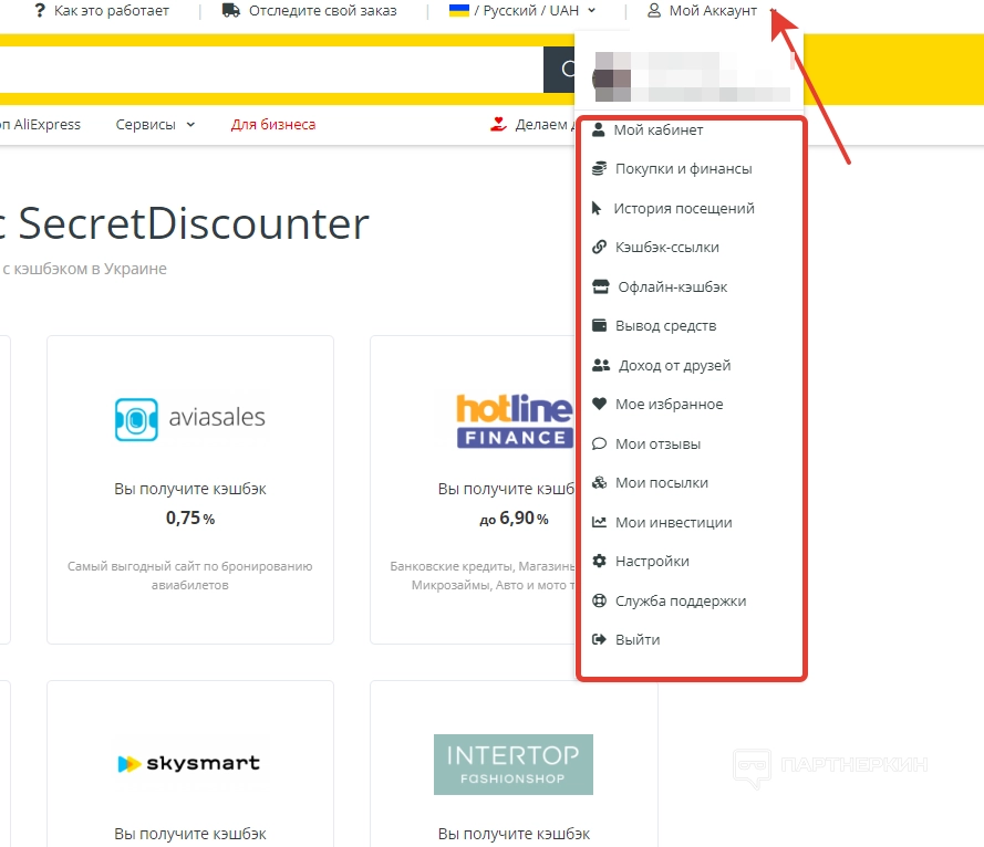 Чтобы попасть в настройки личного кабинета, пользователю нужно кликнуть на кнопку «Мой аккаунт» в верхнем правом углу. Откроется контекстное меню с разными разделами, каждый из которых мы разберем ниже.