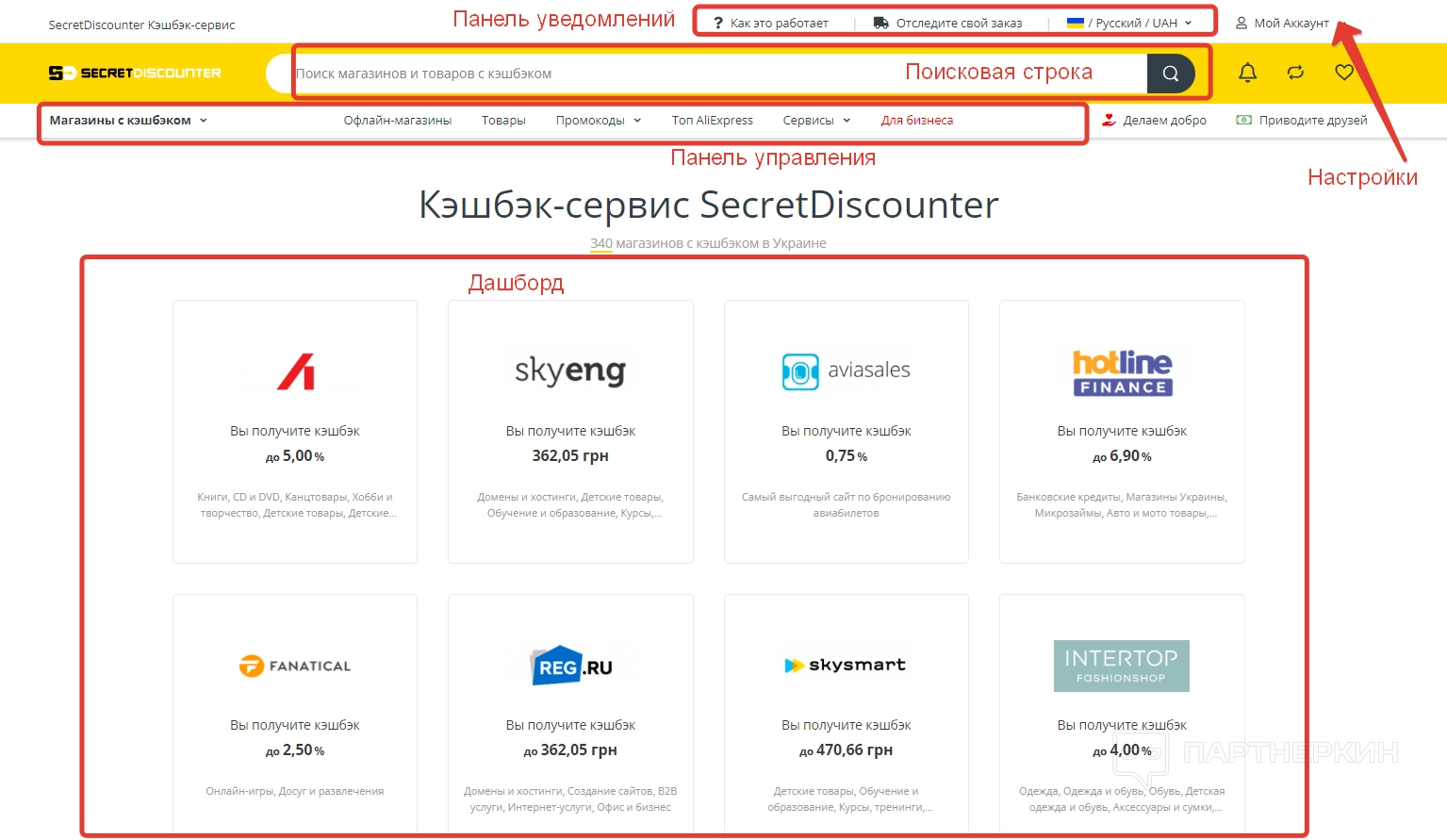 Стартовая страница личного кабинета ничем не отличается от стартовой страницы сайта. Все в тех же местах отображается дашборд, панель управления, поисковая строка и панель уведомлений. Единственное отличие в том, что после регистрации появится доступ к настройкам учетной записи.