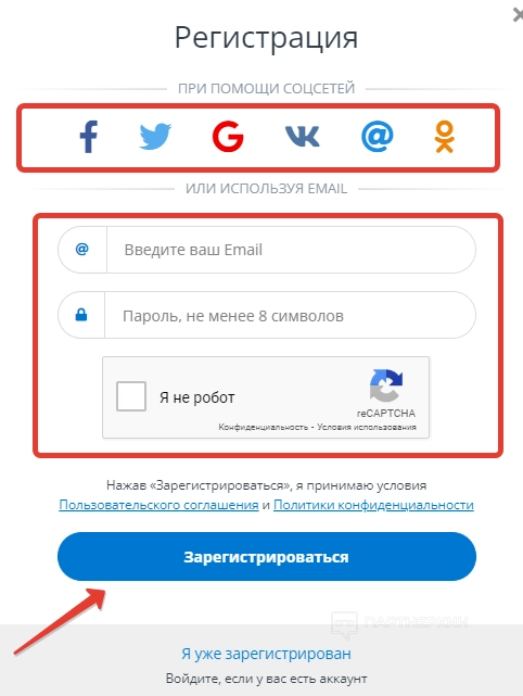 Для получения доступа к функциональным особенностям сервиса пользователь должен зарегистрировать учетную запись. В первую очередь открываем официальный сайт и кликаем на «Зарегистрироваться» в правом верхнем углу.