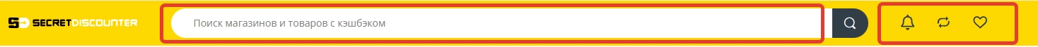 Под панелью уведомлений расположена строка, с помощью которой можно искать офлайн и онлайн-магазины, а еще разные товары, где доступен кешбэк. Рядом с поисковой строкой находится колокольчик, отображающий входящие сообщения, инструмент для сравнения товаров и кнопка для добавления позиции в «Избранное».
