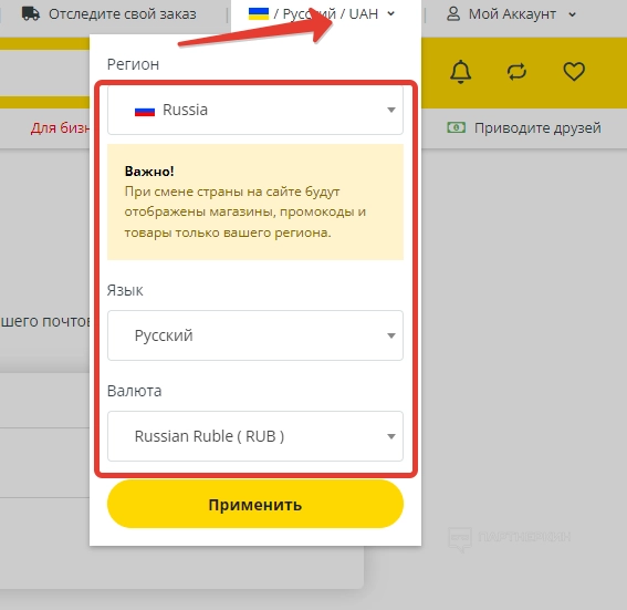 Также внимание заслуживает возможность выбора региона, валюты и языка. Допустим, если пользователь находится в Беларуси, то с помощью фильтра можно выбрать именно те магазины, которые функционируют и позволяют покупать с кешбэком на территории Беларуси.