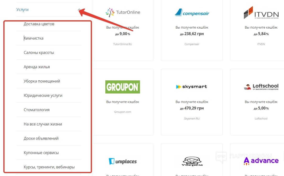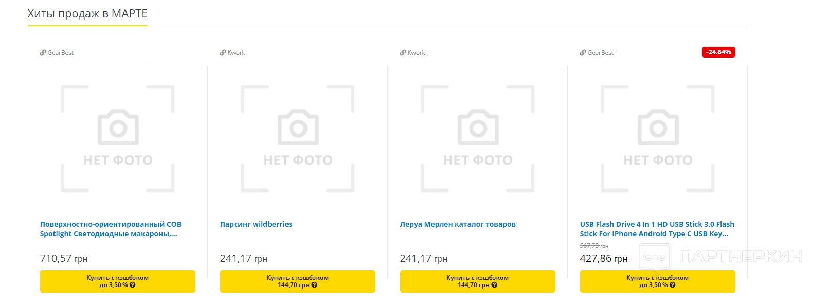 Этот раздел отображает товары, в которых доступен кешбэк. В верхней части страницы пользователь найдет популярные категории торговых позиций: