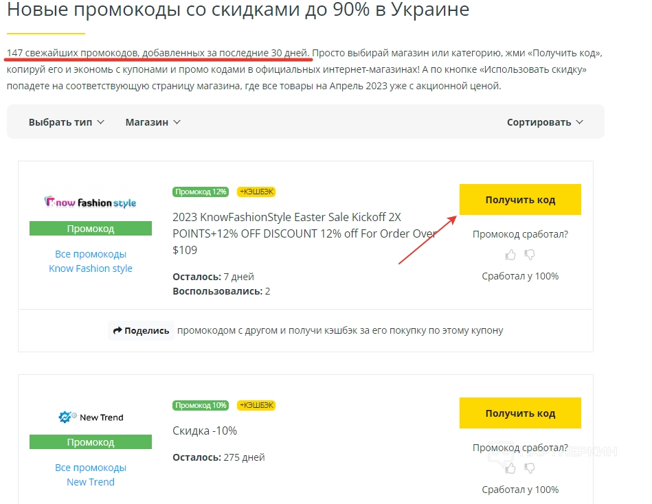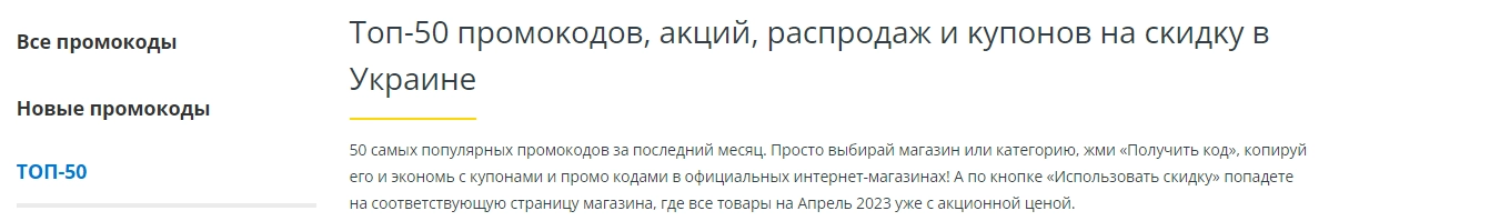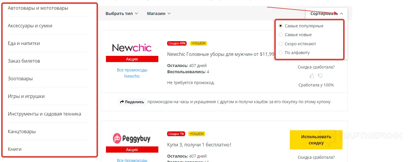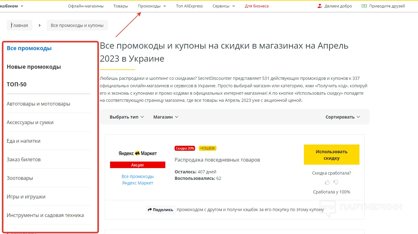 - Промокоды. Здесь есть промокоды и купоны на скидки в магазинах на текущий месяц. Купоны распределены по категориям.
