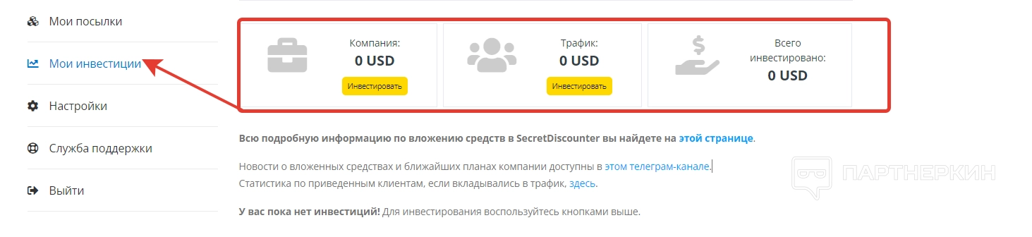 - Мои инвестиции. Тут можно ознакомиться с количеством финансовых средств, которые были инвестированы в компании и трафик.