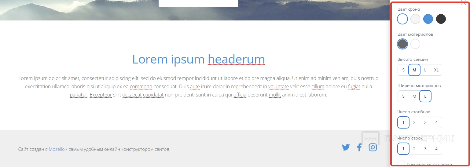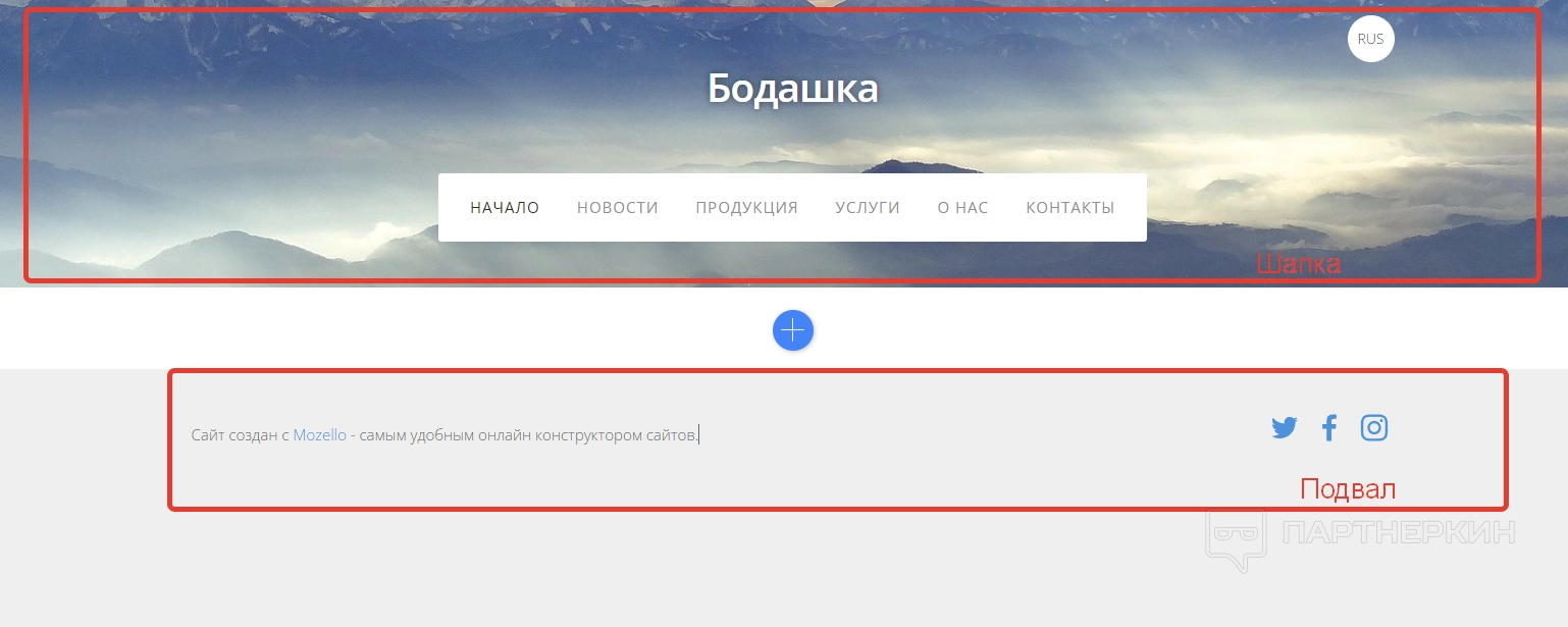 Обращаем внимание, что шапка с навигационным меню и подвал останутся на своих местах. Единственное, что с ними может сделать пользователь – изменить изображение, фон и текстовые вставки.