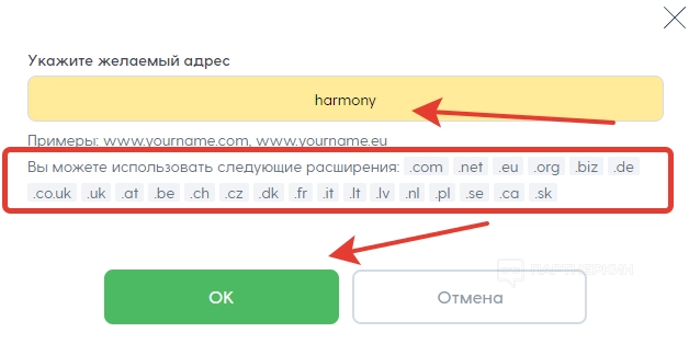 В поисковом поле вводим названием и жмем «Ок». При желании можно сразу выбрать расширение, кликнув на один из предложенных вариантов. Также можно подключить сторонний домен, но для этого нужно приобрести платную подписку.