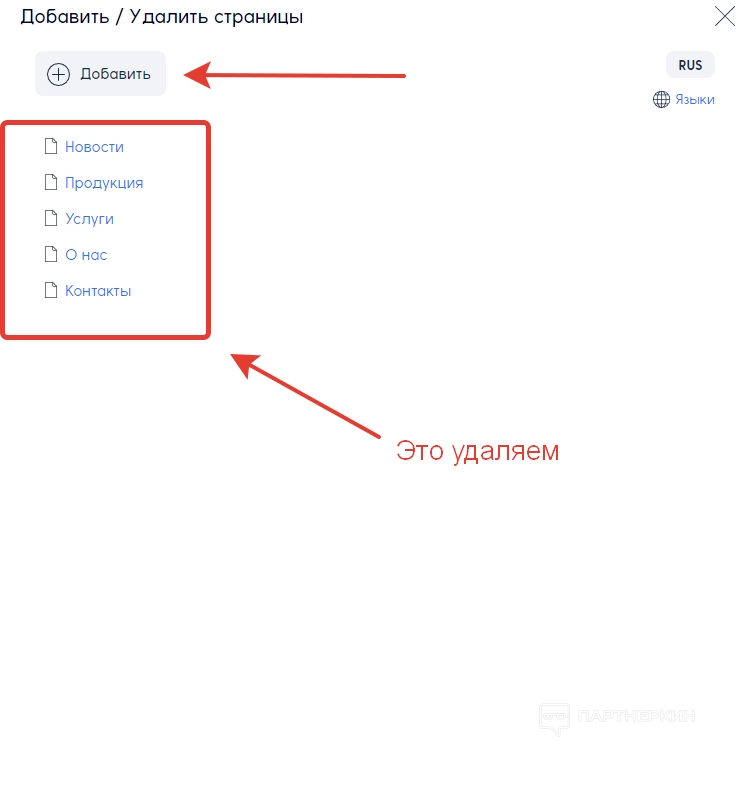 1. Страницы . Блок, в котором отображаются страницы сайта. Здесь можно добавлять дополнительные страницы.