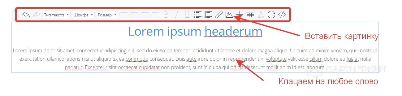 В рабочей зоне появится выбранный блок с текстом-рыбой. Чтобы ввести свой текст, пользователю достаточно навести на него курсор мышки и клацнуть  на левую кнопку. Текст тут же выделится, а над ним появится панель с инструментами, с помощью которой можно: