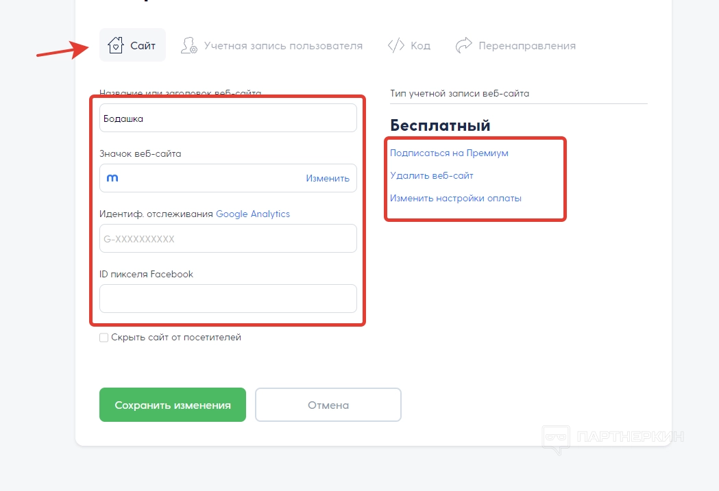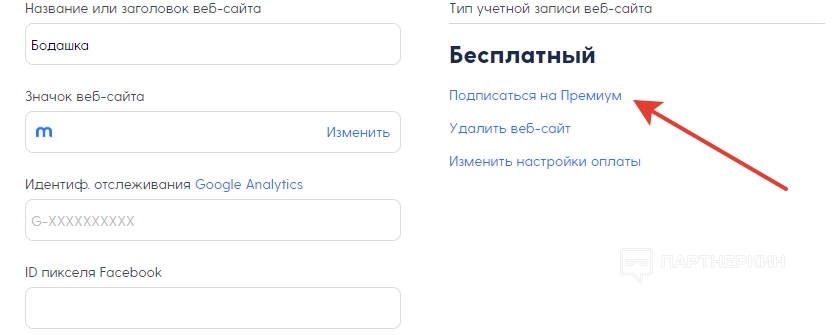 Также здесь есть разделы для изменения настроек оплаты, подписки на премиум и удаления сайта.