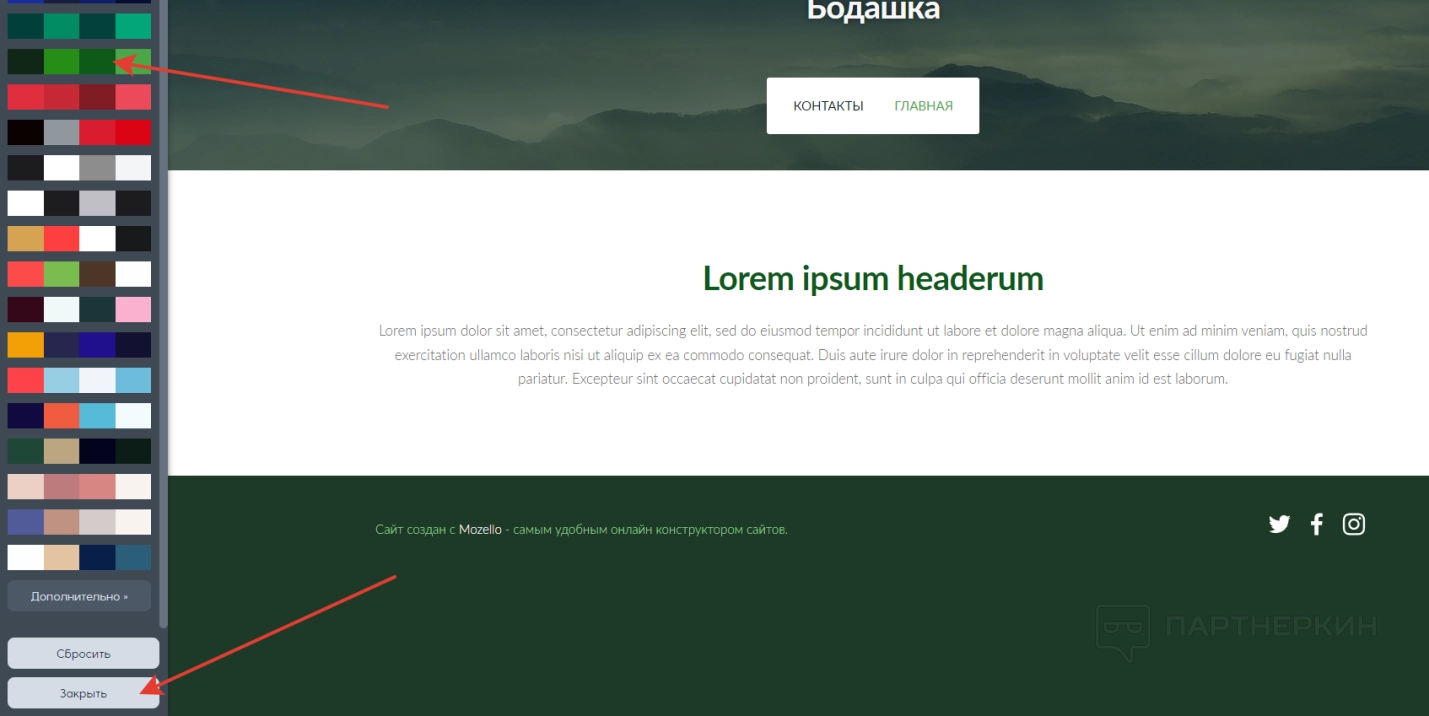 При нажатии на «Изменить цветовую схему» вместо панели управления появится каталог цветовых схем, которые можно применить для смены цветового оформления сайта. Выбираем, например, зеленый и жмем на кнопку «Закрыть».