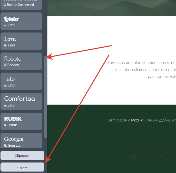 Теперь нужно изменить цветовую схему. Для этого снова кликаем на раздел «Дизайн» и открываем соответствующую вкладку. В открывшейся форме отобразятся доступные варианты. Выбираем, например, «Roboto» и жмем «Закрыть».