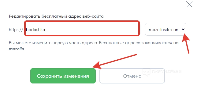 В появившейся форме прописываем название, выбираем доменное имя (mozellosite.com или mozello.shop) и кликаем «Сохранить изменения».
