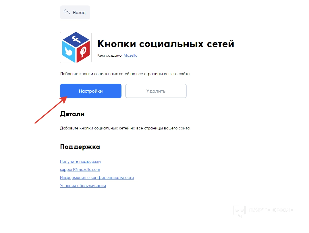 Допустим, владелец сайта хочет разместить кнопки для социальных сетей. Для этого заходим в раздел, выбираем соответствующее приложение и жмем на кнопку «Добавить». После добавления откроется страница, где нужно выбрать пункт «Настройки».