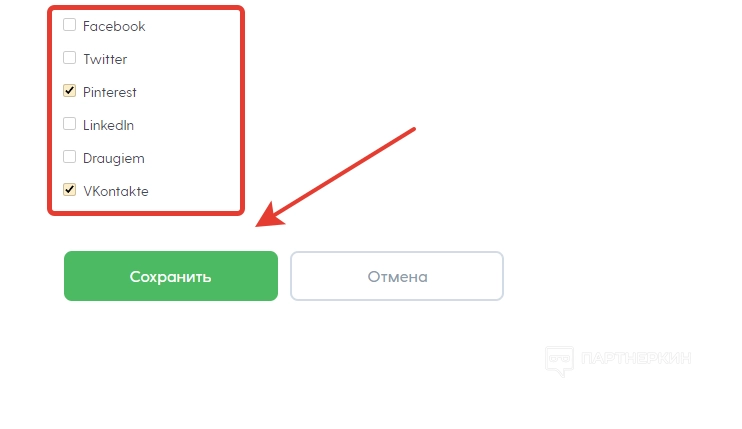 Далее откроется форма со списком поддерживаемых социальных сетей. Ставим галочки напротив нужных вариантов и жмем «Сохранить». После этого кнопки появятся в подвале сайта.