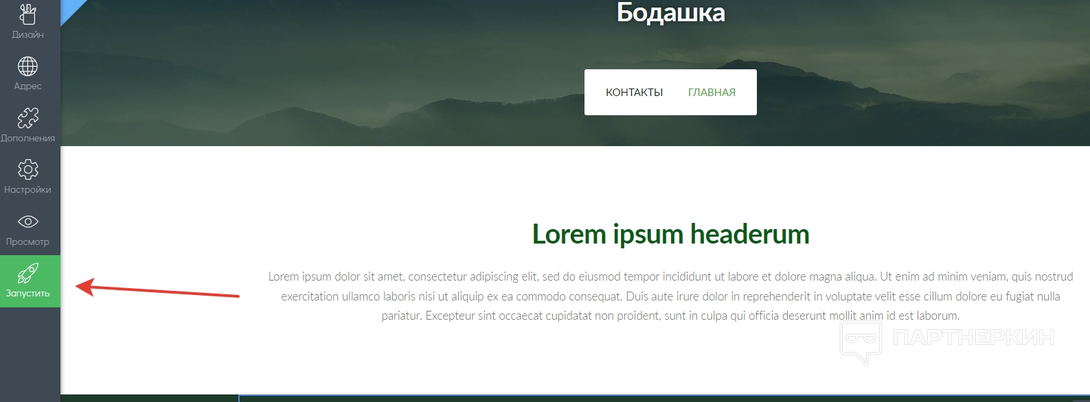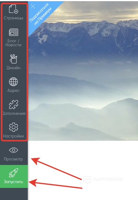 Нажав на кнопку «Просмотр», пользователь запустит функцию предварительного просмотра. Кнопка «Запустить» нужна для публикации сайта.