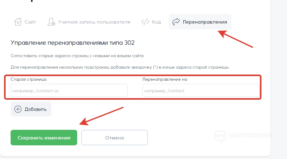 Также обращаем внимание на вкладку «Перенаправление», с помощью которой пользователь может перенаправлять посетителей сайта со старых страниц на новые. Для этого нужно всего лишь указать URL-адреса в соответствующих вкладках и нажать «Сохранить изменения».