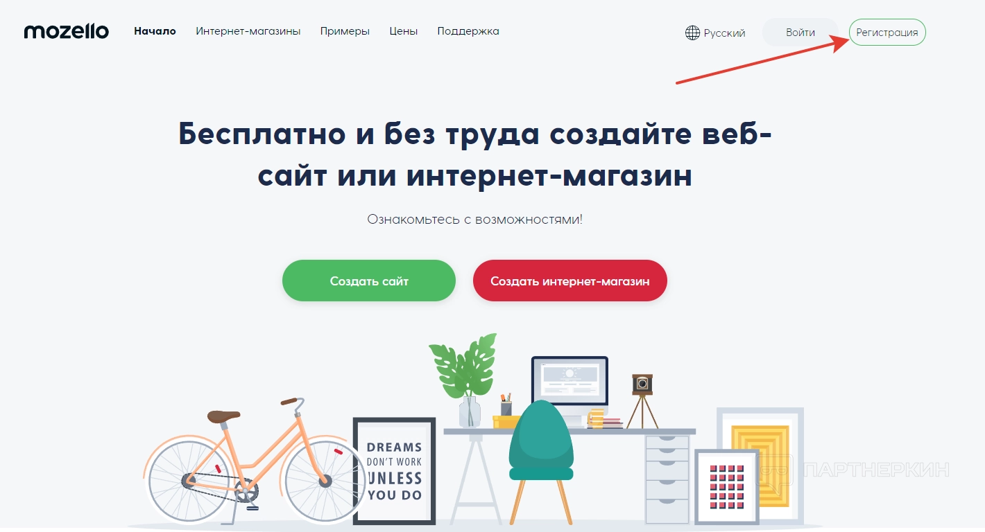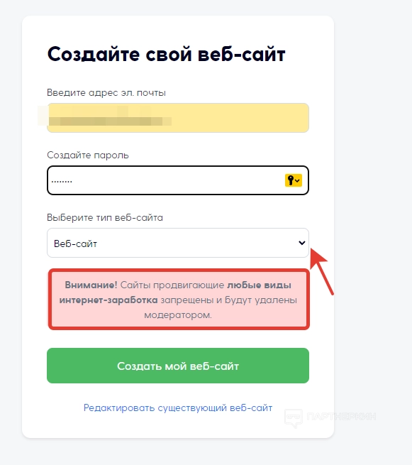 В процессе регистрации нужно указать электронную почту и пароль. Также пользователь должен выбрать тип сайта: