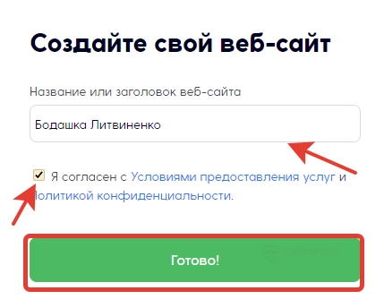 Когда пользователь кликнет на кнопку «Создать мой веб-сайт», на экране отобразиться форма, где нужно будет указать название или заголовок создаваемого ресурса. В конце даем согласие с условиями использования и жмем «Готово».