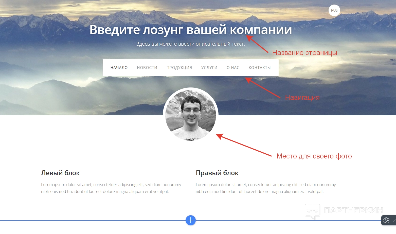 Выбрав макет, пользователь попадет на стартовую страницу конструктора, где будет осуществляться редактирование шаблона. В верхней части экрана отображается шапка, где пользователь найдет навигационное меню, название странички и место для размещения фотографии. Ниже содержатся блоки для текстовой информации.