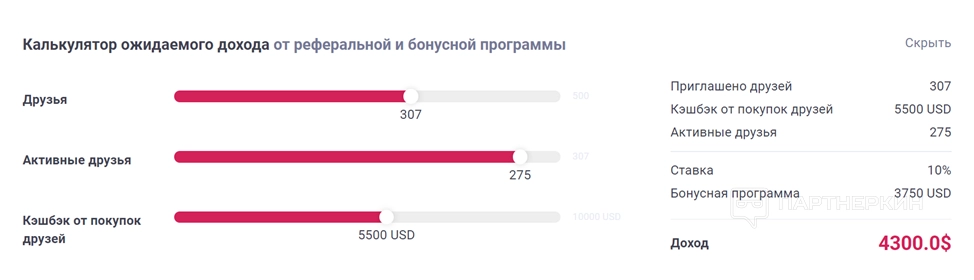 Для удобства на странице есть калькулятор. Он помогает рассчитать точный ожидаемый доход от реферальной и бонусной программы.