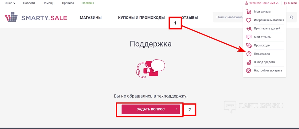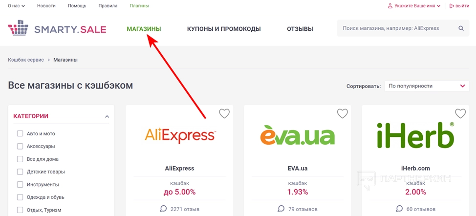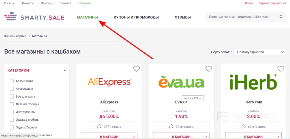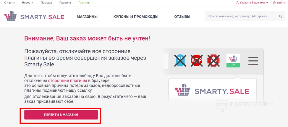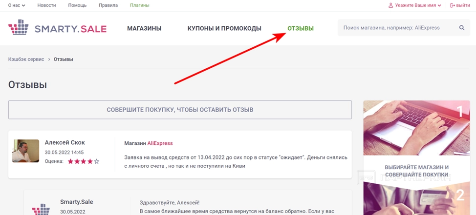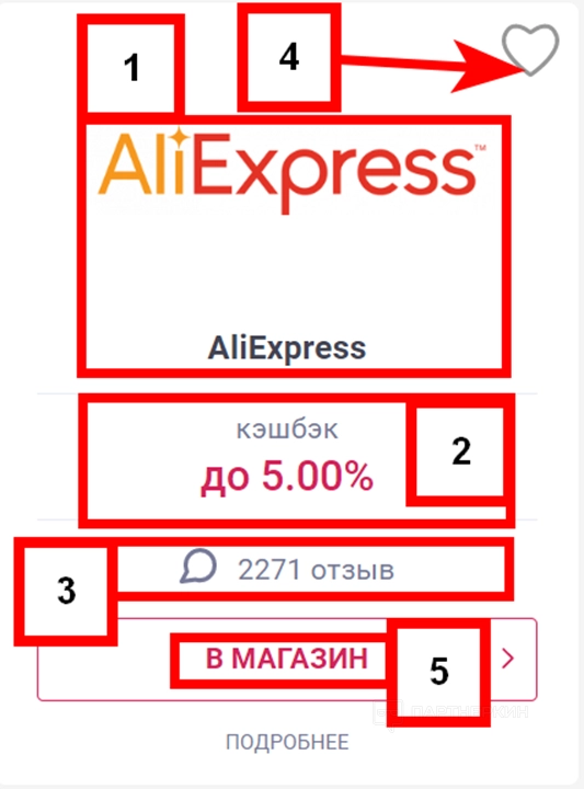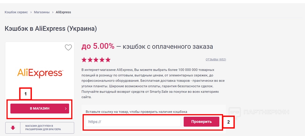 - Перейдите в магазин (1), или проверьте ссылку на наличие кешбэка (2).