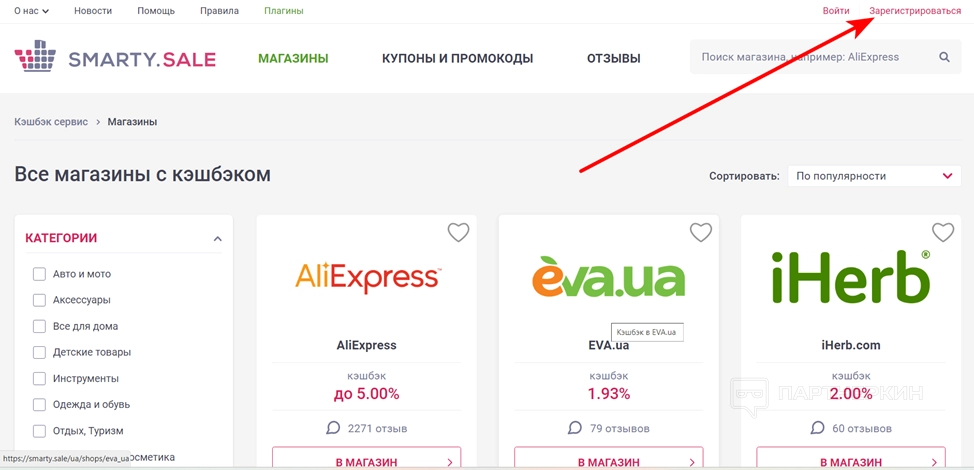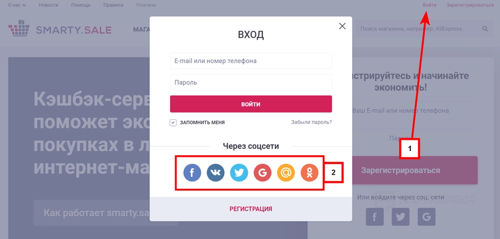 Smarty.saleвыберите пункт «Зарегистрироваться».