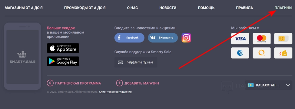 - На главной странице опуститесь в самый низ, и выберите вкладку «Плагины».