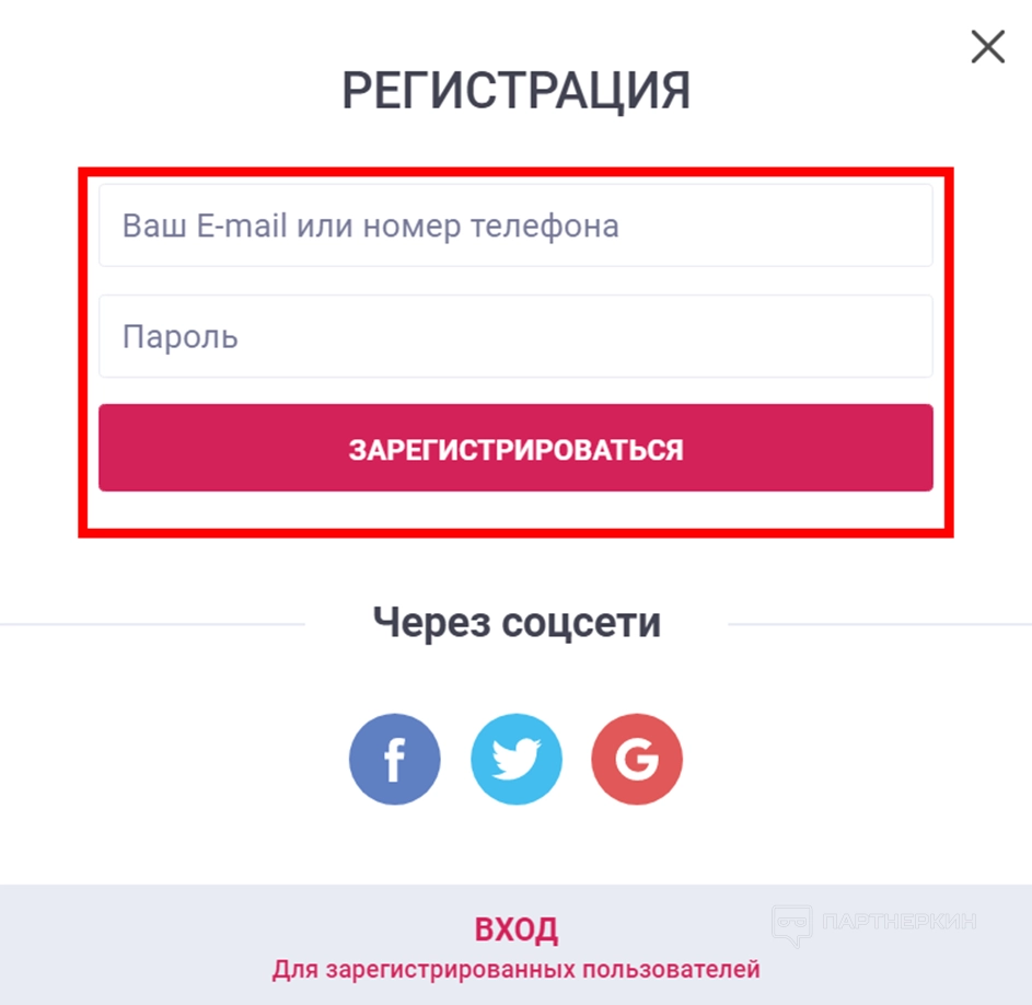 - Откроется новое окно. Введите свой e-mail (или номер телефона) и придумайте пароль. Нажмите на кнопку «Зарегистрироваться».