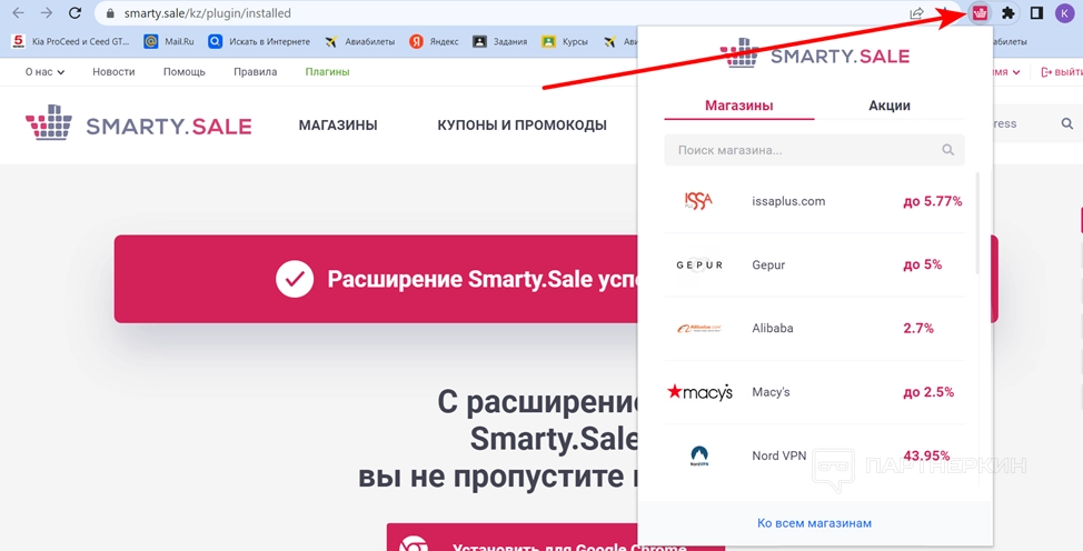 - Расширение появится в соответствующем разделе, рядом с адресной строкой. Оно по умолчанию уже работает. В списке магазинов доступен кешбэк.