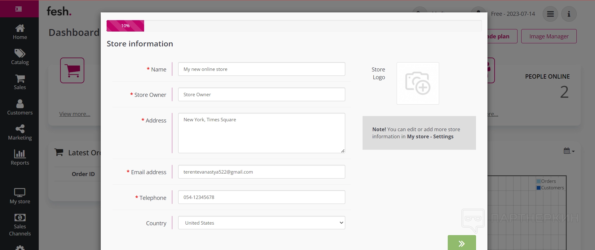 При регистрации нужно указать название своего интернет-магазина, свое имя, почтовый ящик и страну проживания. После нужно подождать пару минут, пока создастся интернет-магазин.