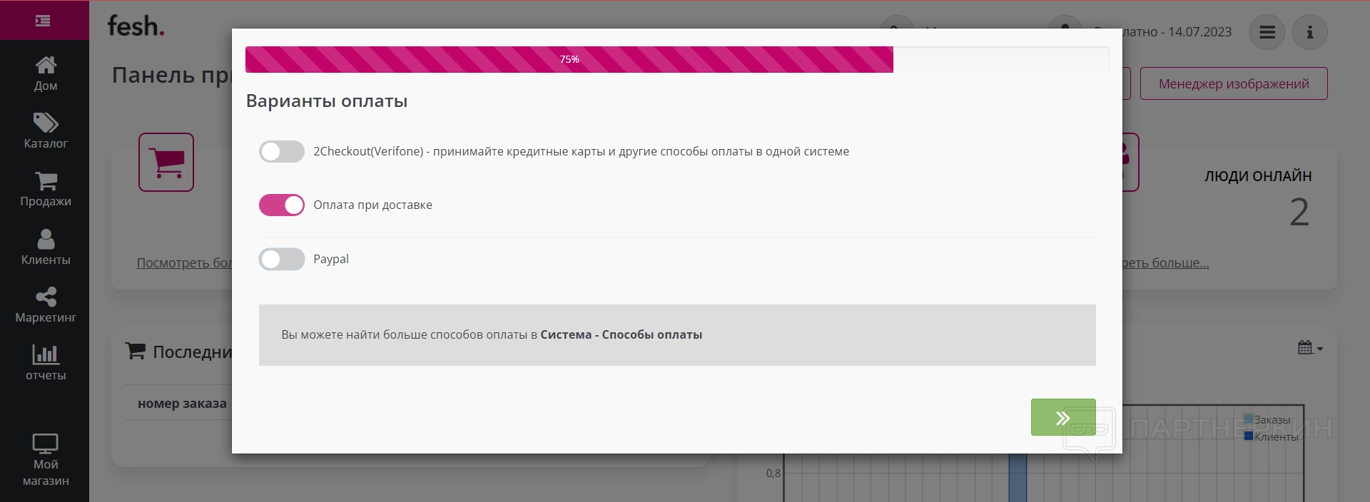 Далее предложат указать варианты оплаты — можно выбрать систему 2Chekout для приема карт и других вариантов платежей, оплату при доставке или с помощью PayPal. Если хочется указать несколько способов, то можно выбрать два варианта сразу.