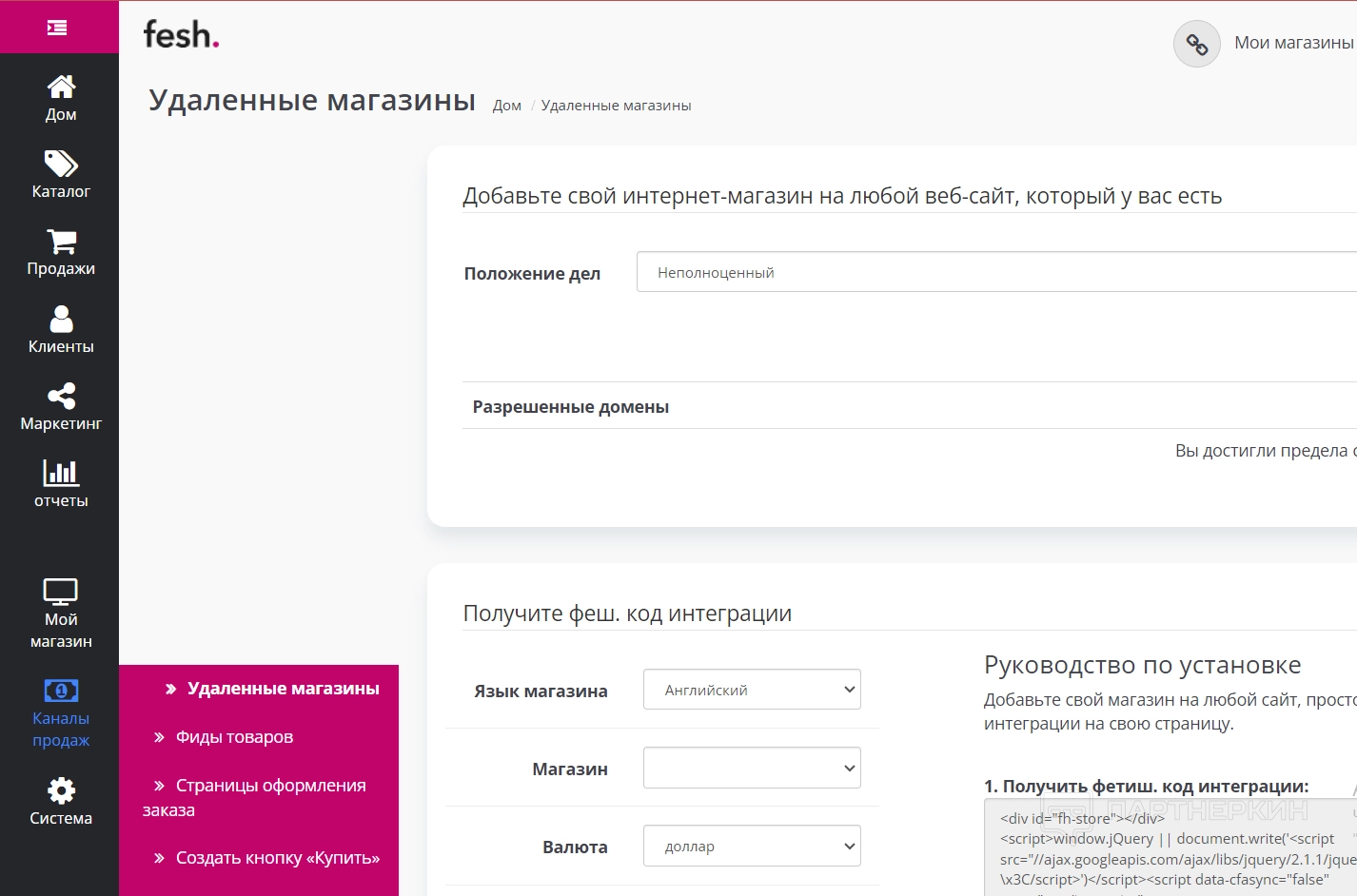 Каналы продаж — тут отображаются удаленные магазины пользователя и фиды товаров. Также здесь можно добавлять кнопки в магазин и редактировать страницу оформления заказа.