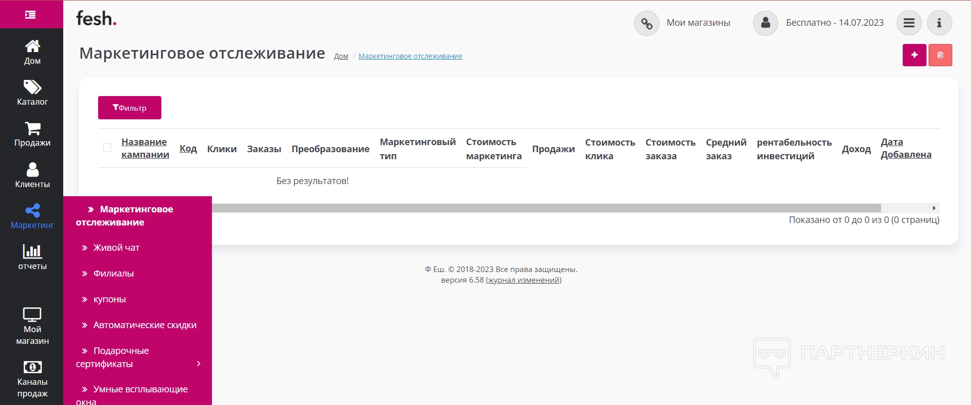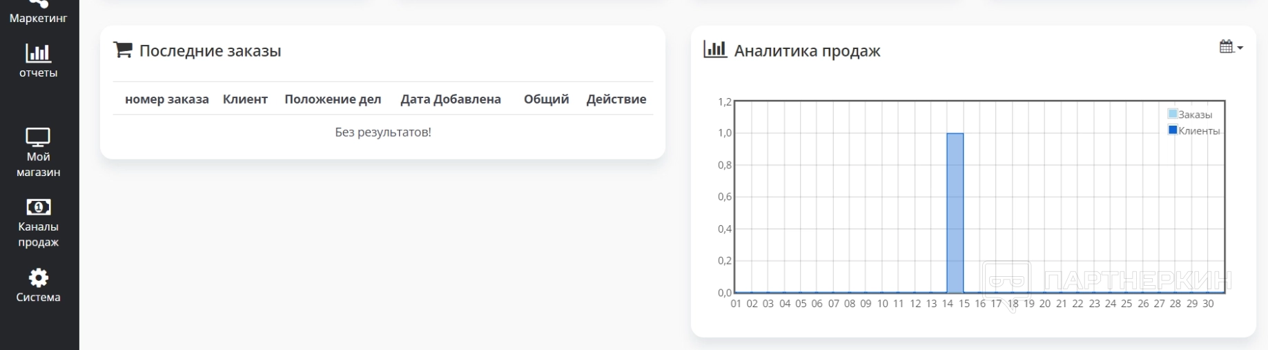 Маркетинг — это довольно полезный раздел, который показывает все данные о продвижении магазина. Например, можно посмотреть информацию и рекламных кампаниях — клики, заказы, маркетинговый тип рекламы, стоимость продвижения и так далее.