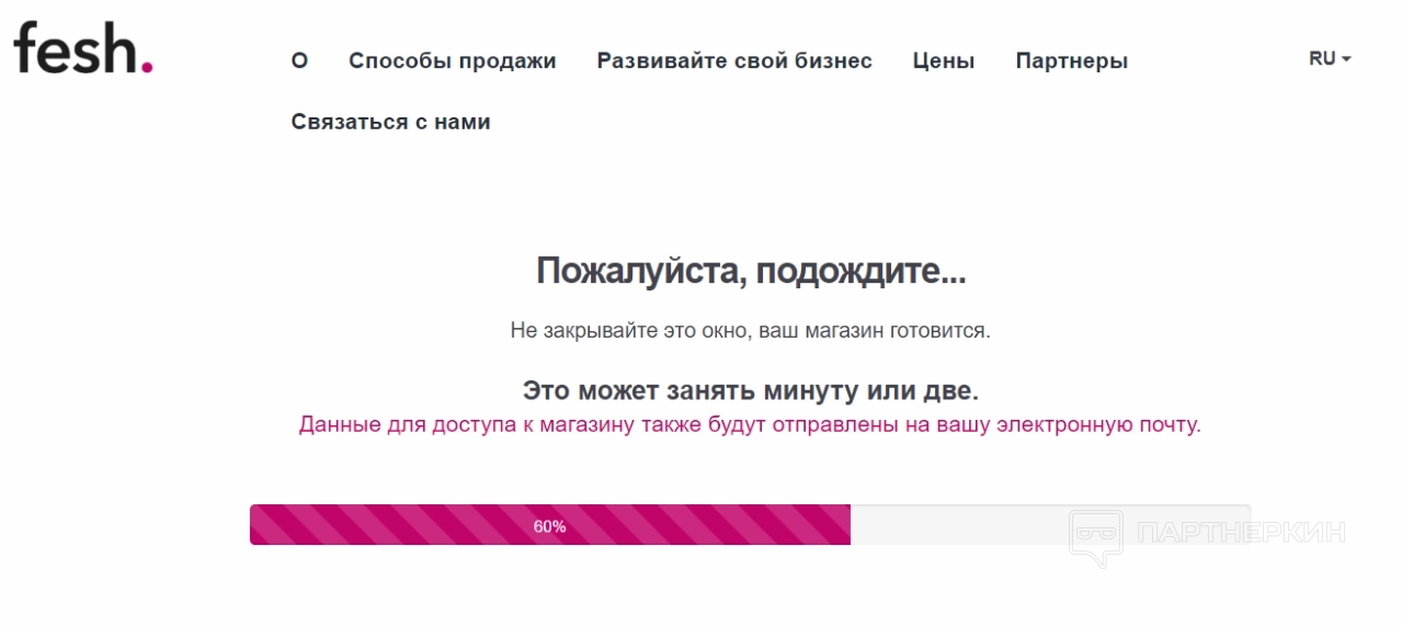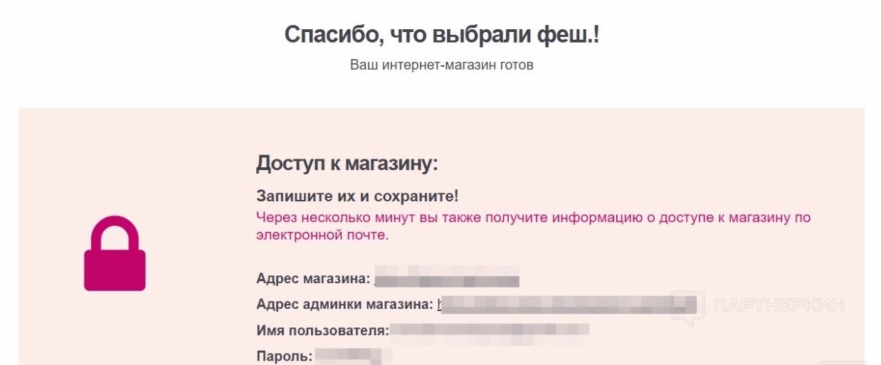 Как только пройдет определенное время, все данные для входа будут представлены пользователю, в том числе и ссылка на его магазин.